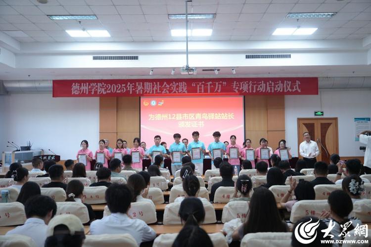 启动仪式上,德州学院党委委员、副校长蒋涛涛介绍了德州学院2025年暑期社会实践“百千万”专项行动的组织情况,并从组织层面和个人层面对此次社会实践活动提出了要求。共青团德州市委书记王俊程为德州12县市区青鸟驿站站长颁发证书。会上宣读了共青团中央关于2024年度全国大学生“三下乡”社会实践优秀团队的表扬信,与会嘉宾为多支青年志愿服务队、各类重点实践团队及山东省鲁喀专项支教团队授旗,教师代表与学生代表进行了交流发言。