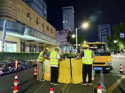 7日晚10时30分后,随着车辆逐渐减少,施工单位开始进场。在淮海路至正洪街之间道路右侧,锥桶和提示灯划出了一条临时占道空间,路口还安排交通引导员提醒避让。