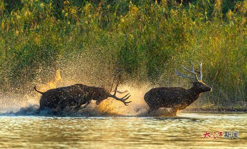 在鄱阳县鸦鹊湖乡,两只麋鹿在追逐。纪绍琴摄