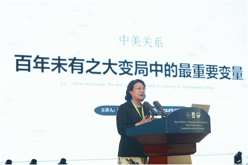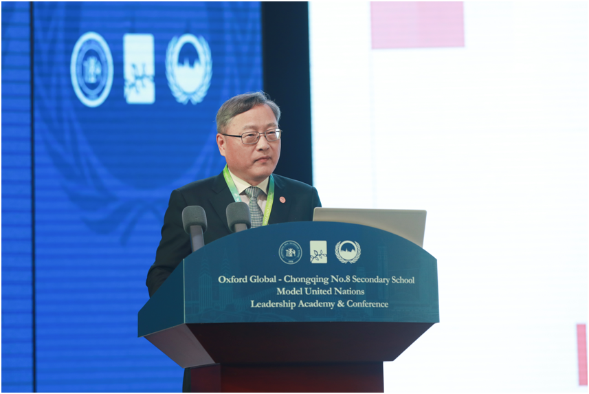 察哈尔学会秘书长、中国驻毛里塔尼亚和突尼斯原大使张建国,北京大学国际关系学院副教授韩华,发表主题演讲,与参与学生分享“外交官生涯”和“当前国际形势”等主题,提出“作为大国青少年,同学们有责任也有必要通过模拟联合国等活动,扩展国际视野,深入了解国际局势、中国外交,以及未来个人的发展方向。”