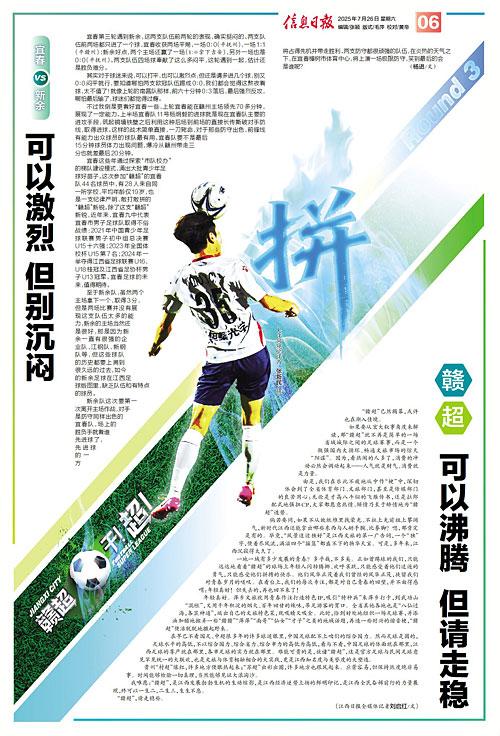 在早已不看国足、中超很多年的许多球迷眼里,中国足球配不上咱们的综合国力。然而足球是圆的,足球水平的高低,不以综合国力、综合省力、综合市力的高低为高低,看与不看,中国足球的体面就在那里,江西足球的尊严就在那里,各市足球的实力就在那里。难能可贵的是,放诸“赣超”,这是官方足球与民间足球意见罕见统一的大联欢,也是文旅与体育相融相合的大实践,更是江西知名度与美誉度的大塑造。