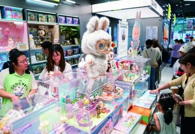 位于新街口商圈的一家潮玩店内热闹非凡,各种款式的盲盒、玩偶等商品销售火爆。 南京日报/紫金山新闻记者 戚珂嘉 摄