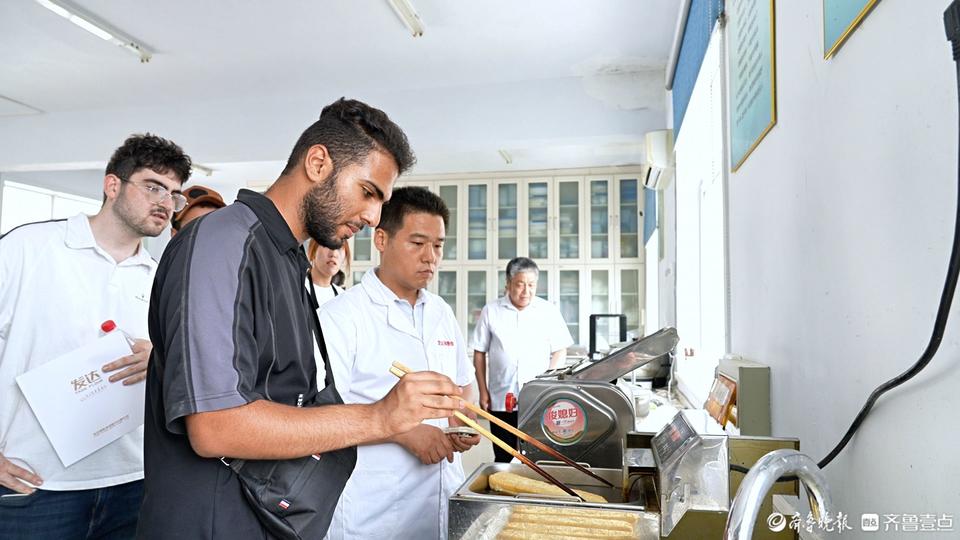 油条制作车间成为科技与美食的融合秀场。留学生们沿着透明廊道,目睹和面醒发、智能油炸、冷却包装等工序,每分钟数百根金黄油条倾泻而出。在食品研发实验室,科技探索转为亲手实践。留学生们在工作人员的指导下揉面醒发、塑形烹炸。当亲手制作的油条蓬松酥脆、面包麦香四溢时,“好吃”的赞叹此起彼伏。
