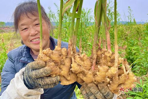 据了解,小黄姜产业的蓬勃发展,也为当地农户提供了就业机会。在小黄姜种植基地工作的张女士表示,在基地里帮忙种植、收获小黄姜,每个月工资有1500多元,对农户们来说是不错的额外收入。如今,小黄姜种植基地需要大量劳动力,通过线上线下相结合的销售模式,第一批年产值达到600多万元,全年用工累计超过1000人次,带动村民人均年增收4000余元,成了当地农户增收的新途径。