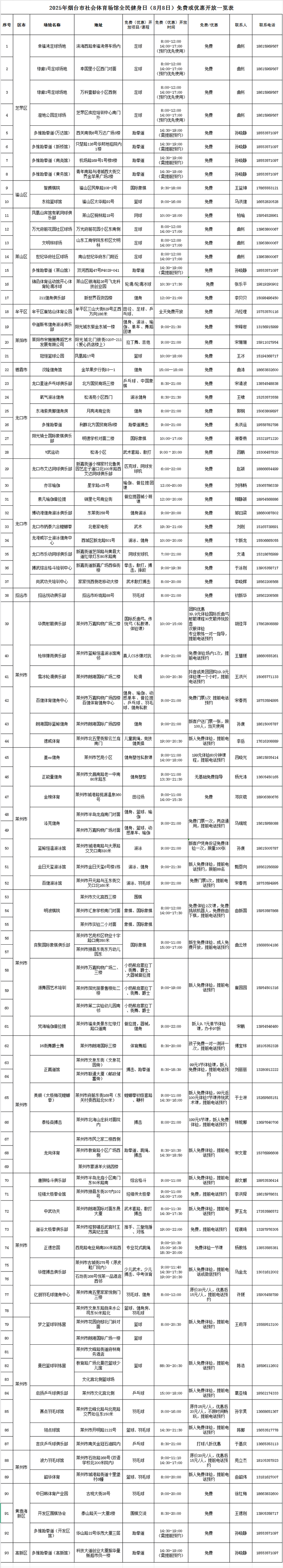 今年8月8日,是全国第17个“全民健身日”。从烟台市体育局获悉,“全民健身日”当天,全市16个公共体育场馆免费对外开放,93个社会体育场馆免费或低收费开放。