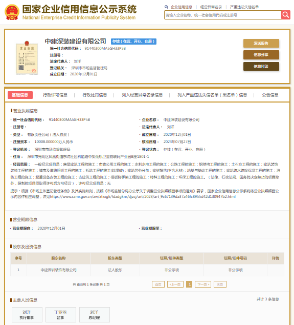 国家企业信用信息公示系统显示,中建深装建设有限公司成立于2020年,注册资本10008万元人民币,法定代表人为刘洋,由中建深圳装饰有限公司全资持股。中建深圳装饰有限公司则成立于1989年,注册资本40588.24万元人民币,法定代表人亦为刘洋。