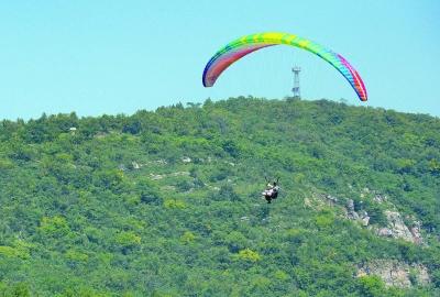 市民从赭洛山一跃而“飞”,借助滑翔伞游览九华村生态美景。