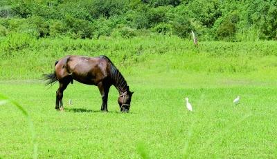 赭洛山脚下,白鹭与骏马相映成趣,悠然自得。
