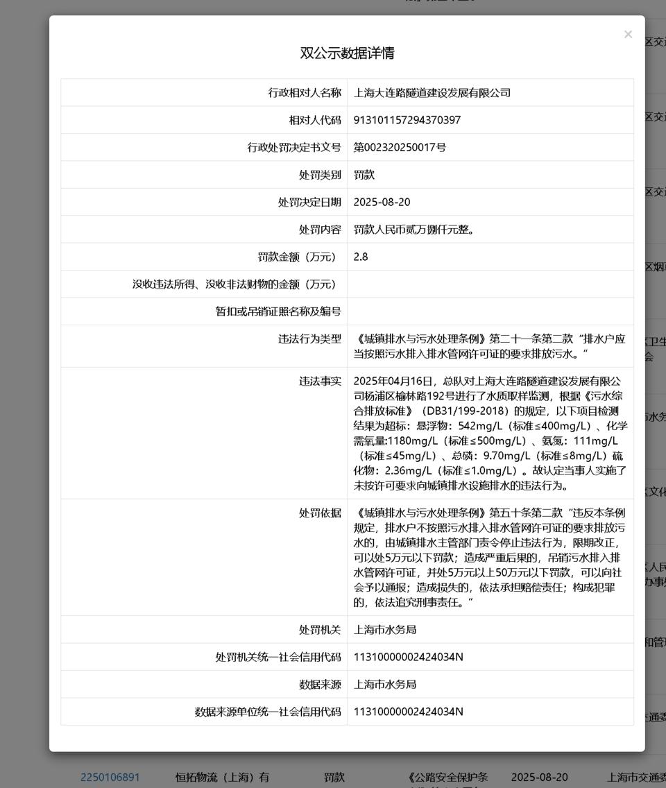 近日,记者从信用中国(上海)获悉,上海大连路隧道建设发展有限公司因违规排水被上海市水务局罚款2.8万元。