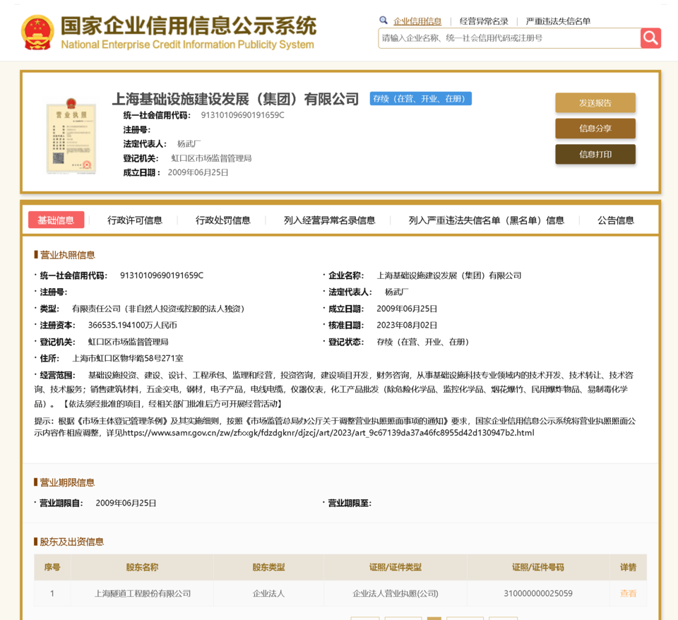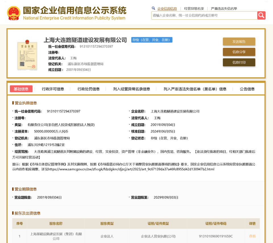 公开信息显示,上海大连路隧道建设发展有限公司成立于2001年9月4日,法定代表人王梅,股东为上海基础设施建设发展(集团)有限公司,后者为隧道股份(600820)全资子公司。