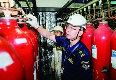 南京海事局龙潭海事处执法人员在“盛帆6号”远洋海轮消防室内检查灭火器、二氧化碳气瓶等消防设备。 南京日报/紫金山新闻记者 戚珂嘉 摄