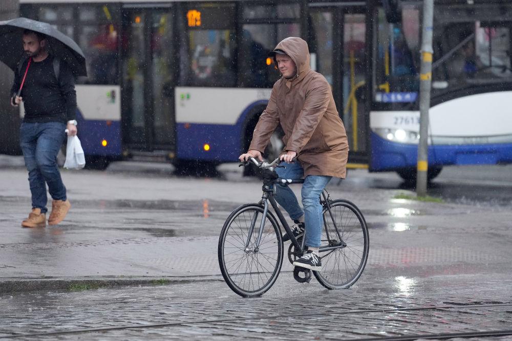 8月26日,在拉脱维亚里加,一名男子冒雨骑车。