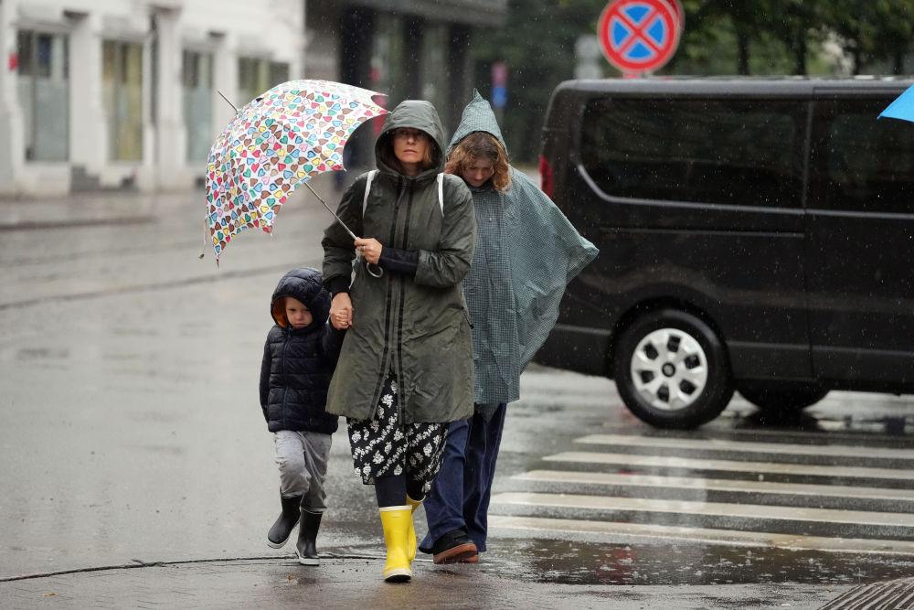 8月26日,在拉脱维亚里加,人们冒雨出行。