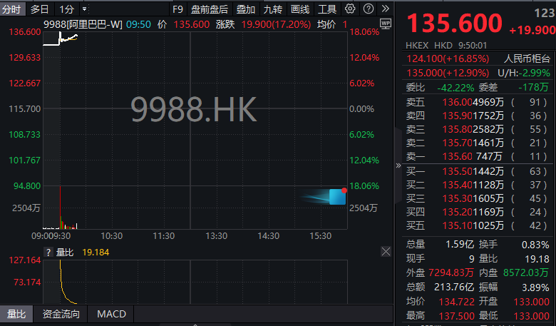 9月首个交易日早盘,阿里巴巴港股(09988)股价跳空高开14.95%,随后短暂上攻后有所回落。截至发稿,该股股价暂报135.6港元/股,上涨17.2%,成交额超过210亿港元,总市值突破2.5万亿港元。