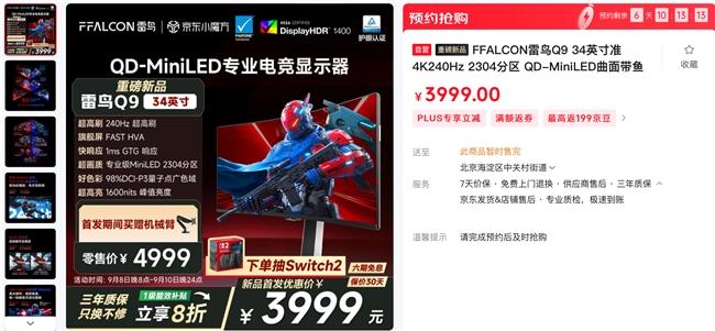 2025年9月1日,雷鸟品牌以极具竞争力的3999元定价推出34Q9 Mini LED电竞显示器,此举不仅完善了其产品矩阵,更凭借华星光电的供应链优势,对中高端显示器市场发起强势冲击。