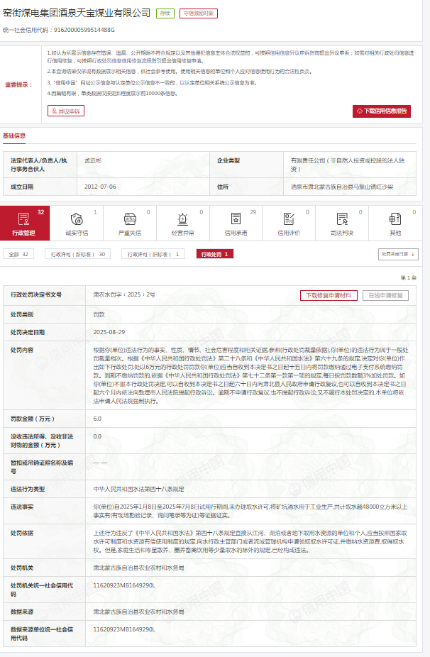 近日,信用中国公示了窑街煤电集团酒泉天宝煤业有限公司的行政处罚决定。行政处罚决定书文号肃农水罚字﹝2025﹞2号显示,该单位自2025年1月8日至2025年7月8日试用行期间,未办理取水许可,将矿坑涌水用于工业生产,共计取水越48000立方米。