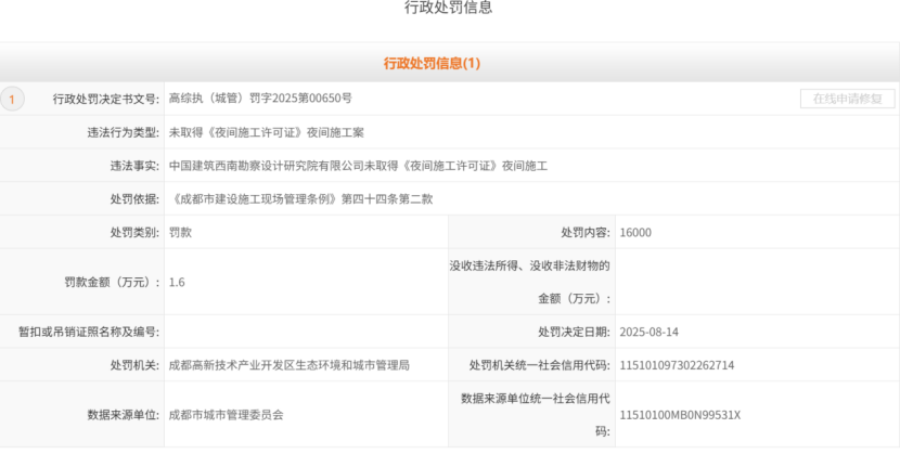 记者从信用中国(成都)获悉,近日,中国建筑西南勘察设计研究院有限公司被罚款1.6万元,行政处罚决定书文号为高综执(城管)罚字2025第00650号。