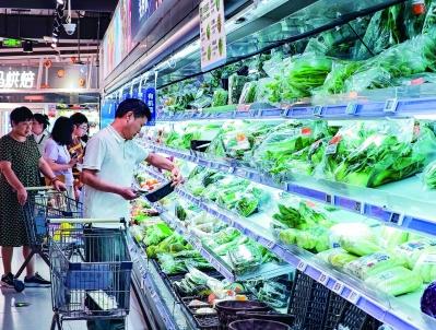 近日,在浦口区大桥北路一家盒马鲜生店内,市民正在选购当日上架的新鲜净菜。