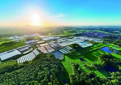 旭日东升,晶桥镇邰村有机蔬菜种植基地的1500亩大棚与农田、池塘、村庄、远山沐浴在晨曦中,构成一幅生机盎然的自然画卷。