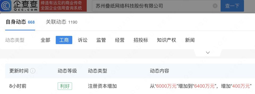企查查APP显示,近日,苏州叠纸网络科技股份有限公司发生工商变更,注册资本由6000万人民币增至6400万人民币。企查查信息显示,该公司成立于2013年,法定代表人为姚润昊,经营范围包括网络文化经营、第一类增值电信业务、第二类增值电信业务等。