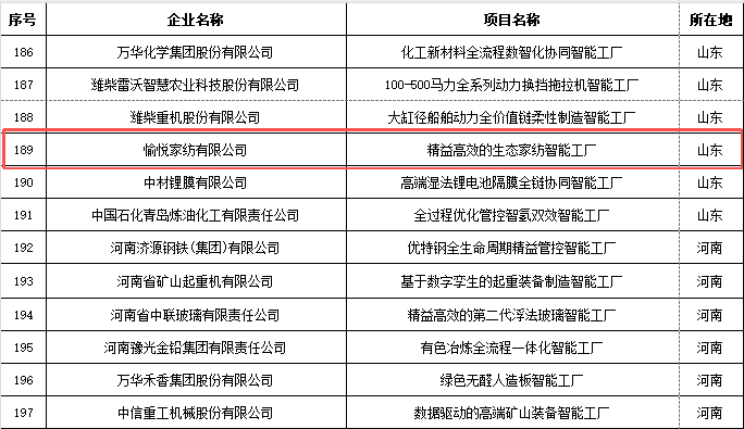 9月4日,工业和信息化部发布《关于2025年度卓越级智能工厂项目的公示》,确定愉悦家纺有限公司进入公示名单。