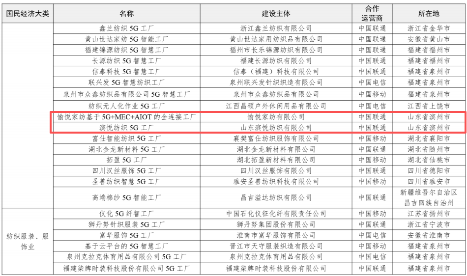 9月2日,工业和信息化部办公厅印发《2025年5G工厂名录》,愉悦家纺有限公司、山东滨悦纺织有限公司成功入选2025年5G工厂名录。