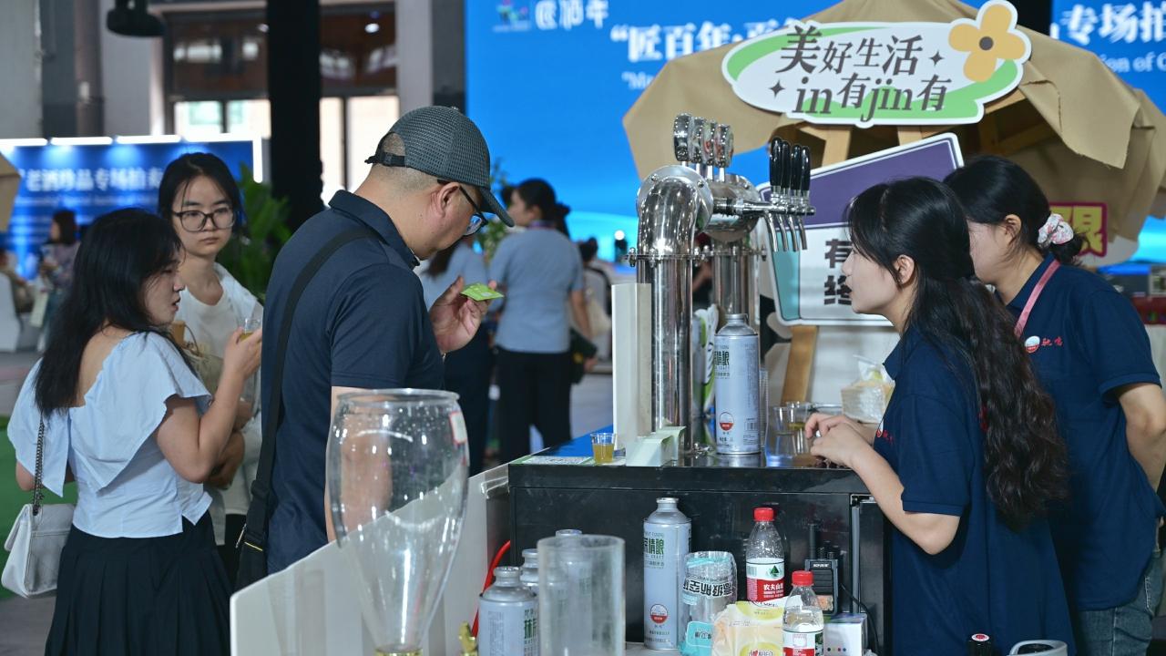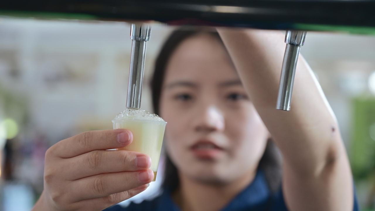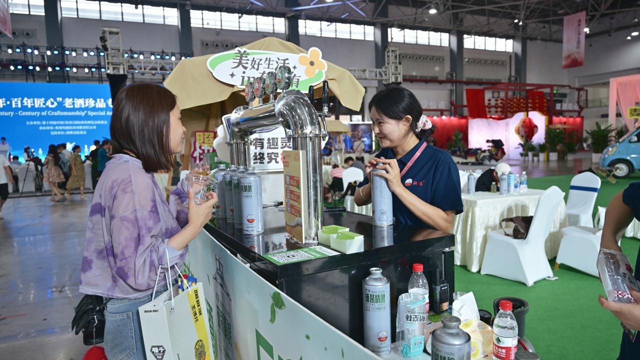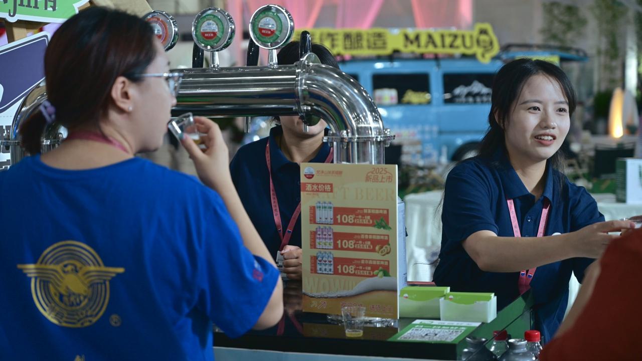 展位工作人员忙得不可开交,一边介绍产品,一边不停补货。很多消费者一次就买四五件,一位刚品尝完的年轻消费者表示:“从来没想过抹茶和啤酒可以这么搭,清爽不苦,茶香回味长,很适合朋友聚会。”