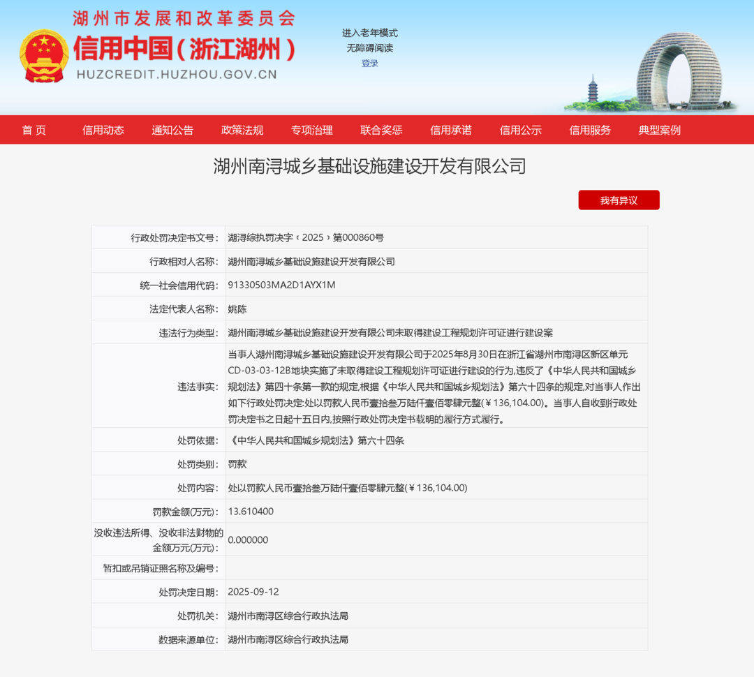 近日,齐鲁晚报·齐鲁壹点记者从信用中国(浙江湖州)获悉,湖州南浔城乡基础设施建设开发有限公司因未取得建设工程规划许可证进行建设案,被湖州市南浔区综合行政执法局罚款13.6104万元。