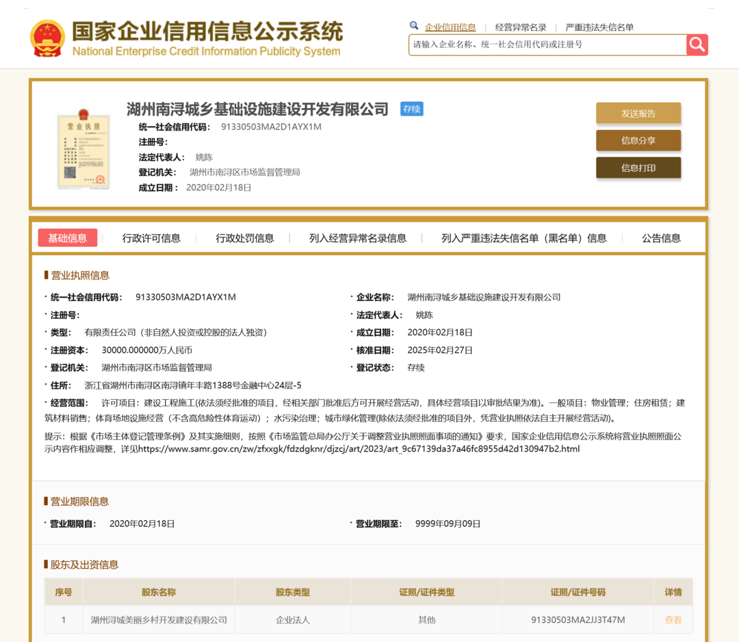 公开信息显示,湖州南浔城乡基础设施建设开发有限公司成立于2020年2月18日,法定代表人姚陈,股东为湖州浔城美丽乡村开发建设有限公司。
