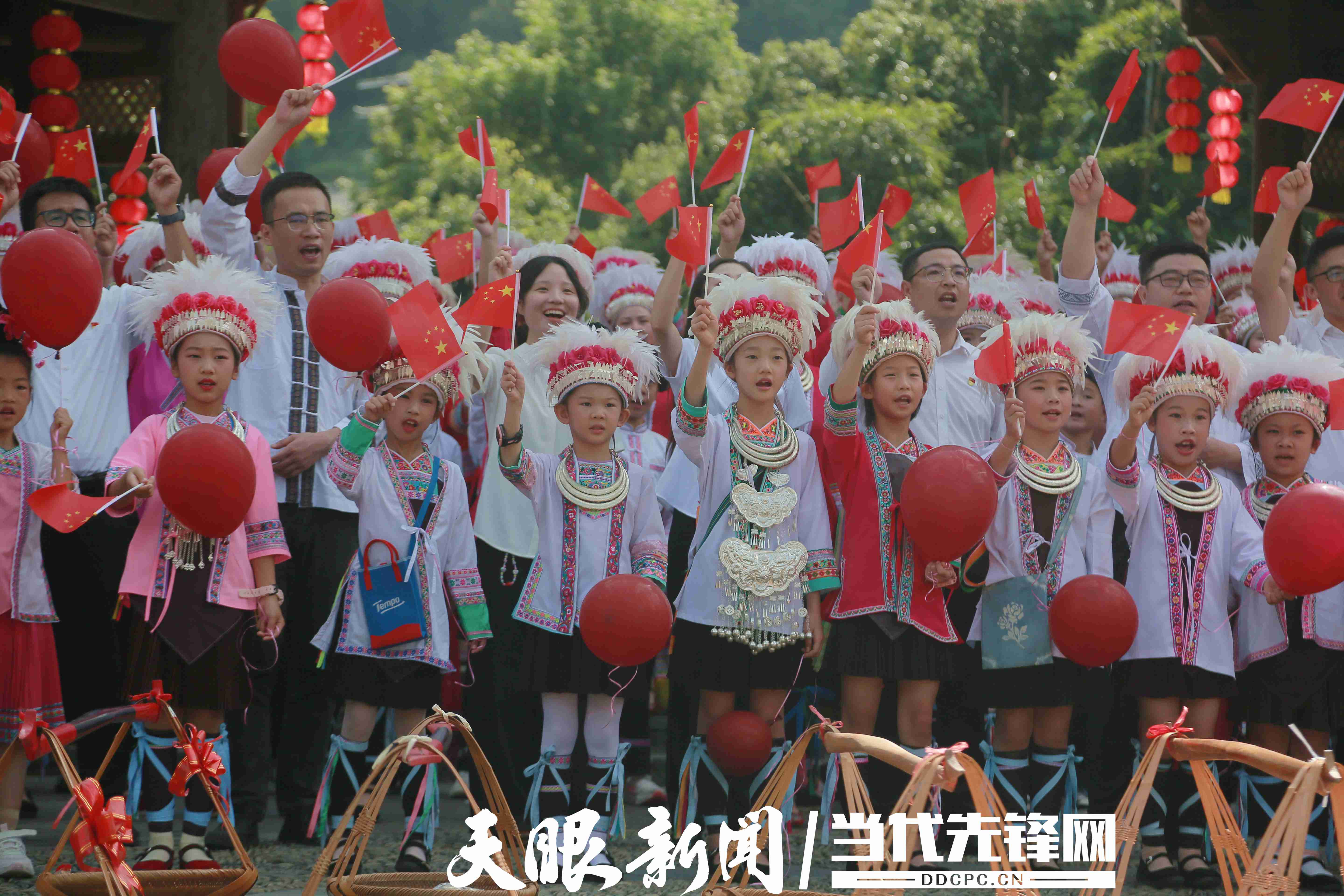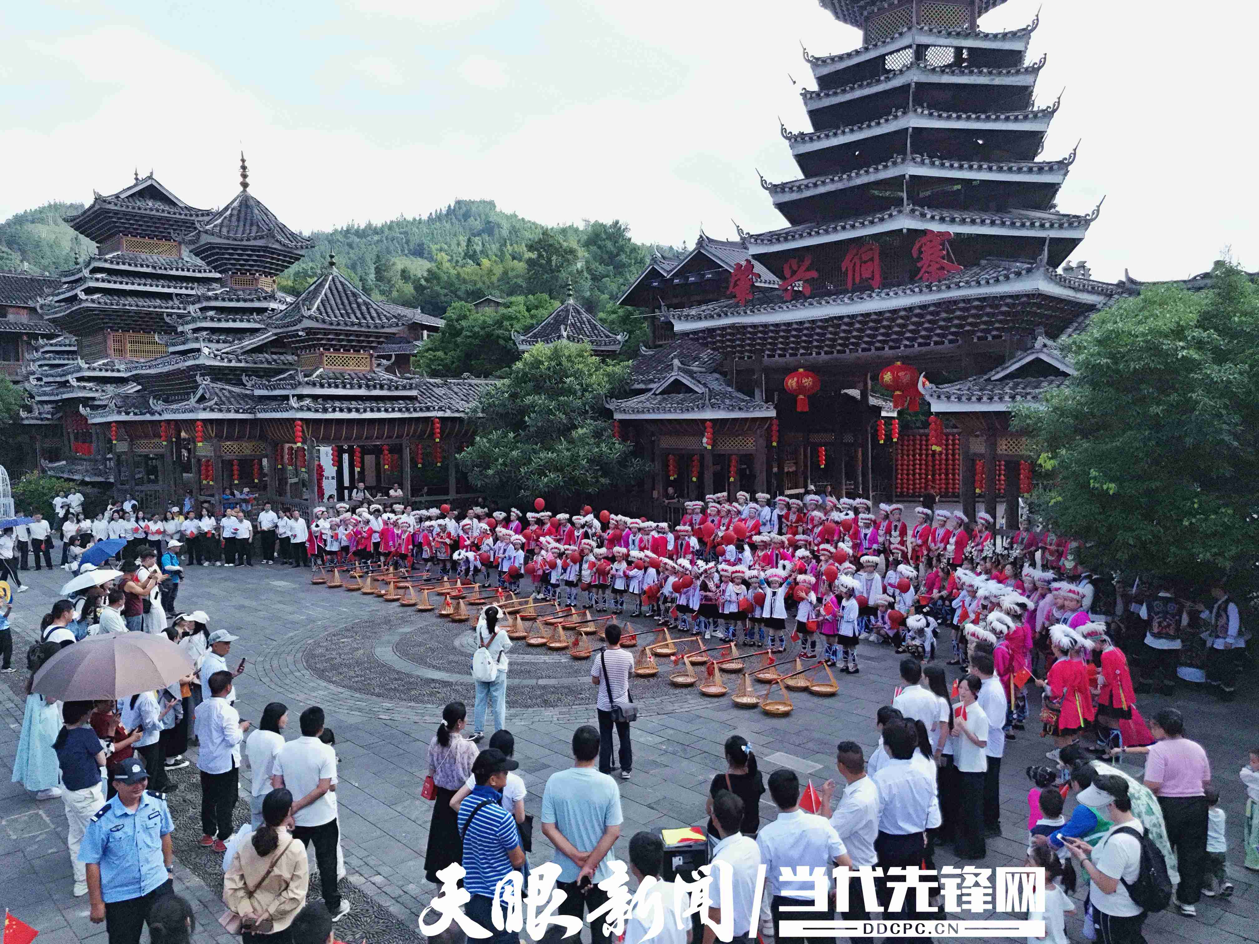 寨门前红灯垂檐,木楼静默,古雅之中平添一抹跃动的喜庆。10月1日上午,贵州黎平肇兴侗寨迎来国庆首日,300余名侗乡干部群众手持小红旗与红气球,身着五彩民族盛装,齐声高唱《我和我的祖国》《歌唱祖国》等歌曲,以“唱红歌·感党恩·庆国庆”主题活动拉开长假序幕。