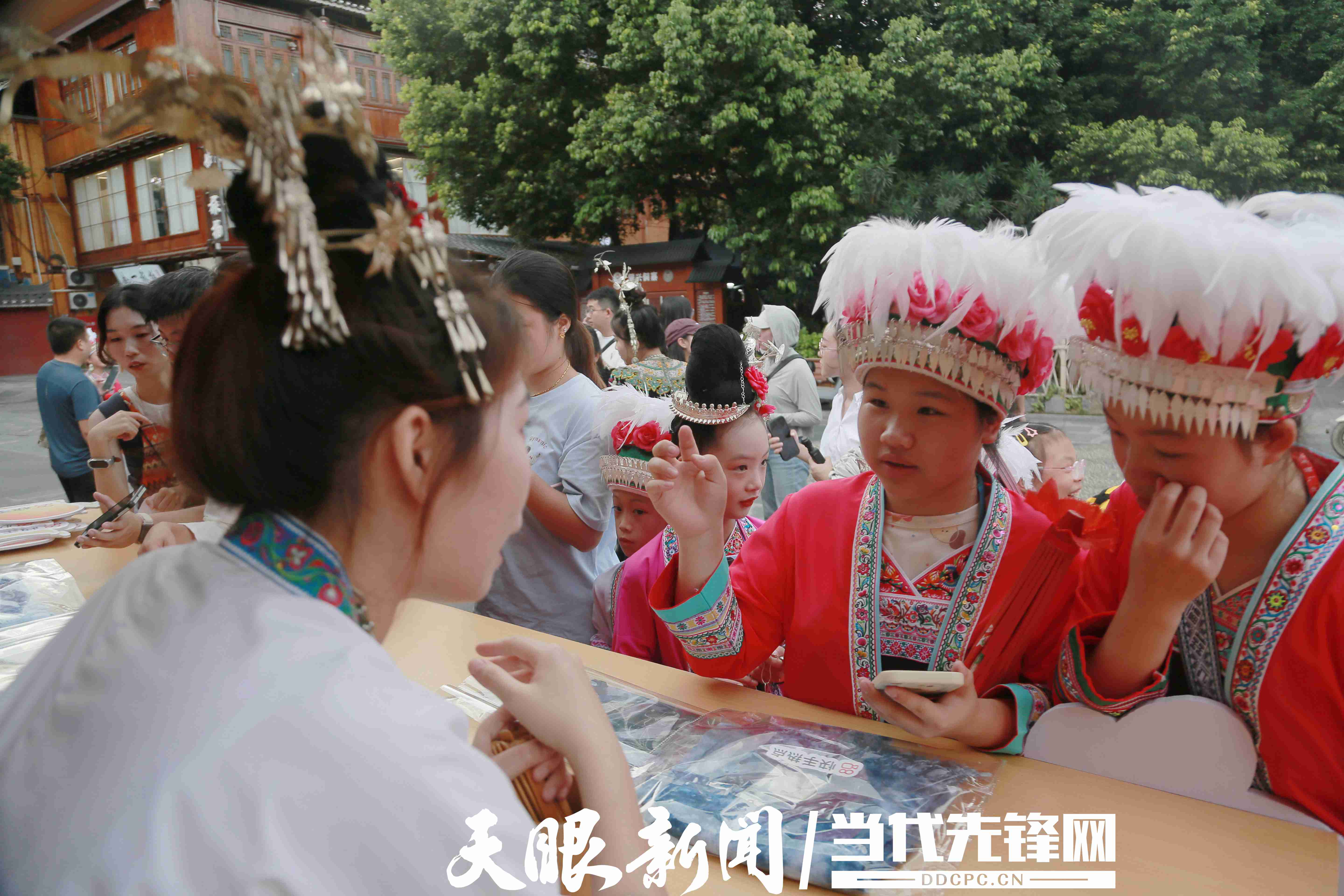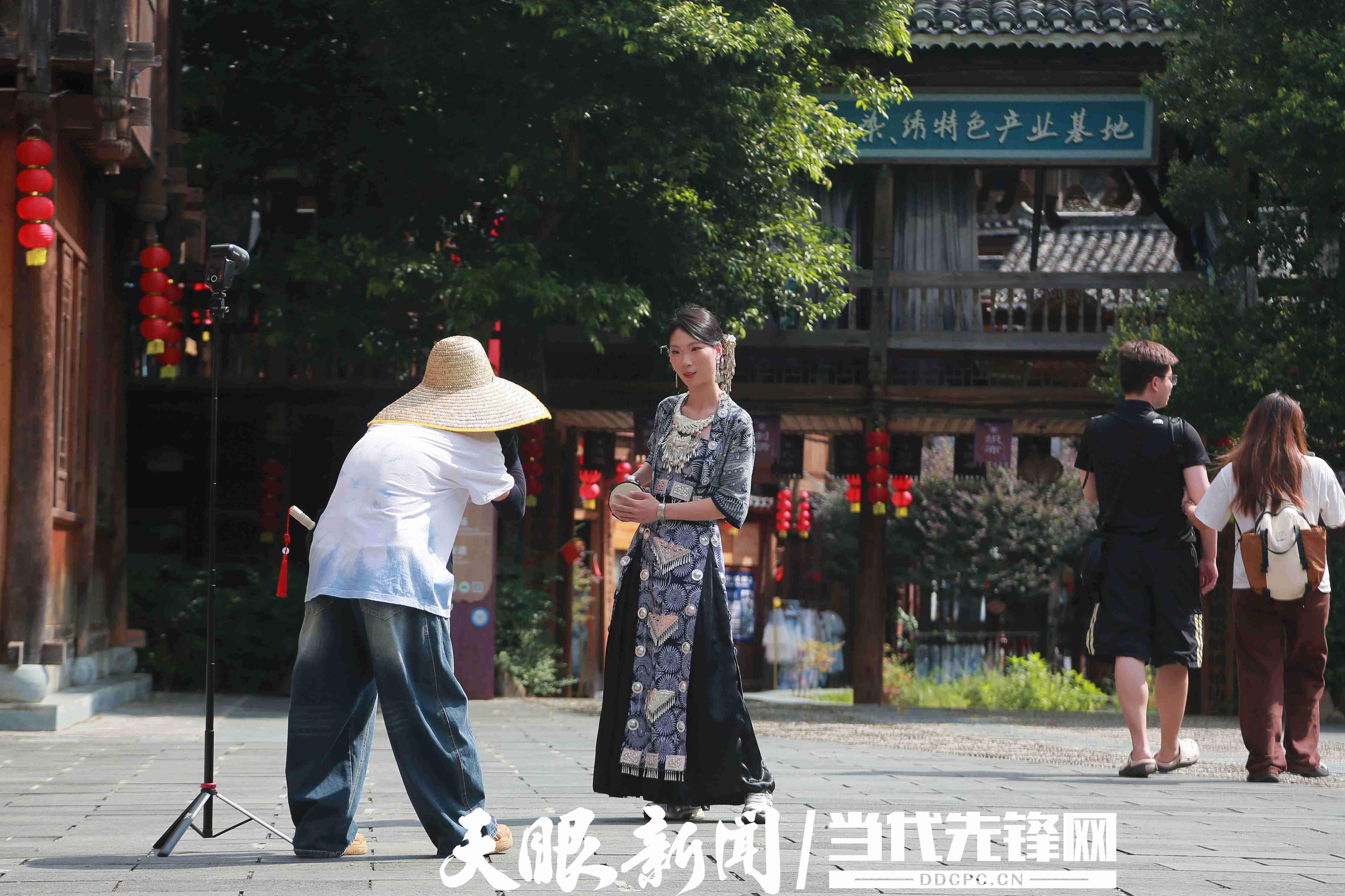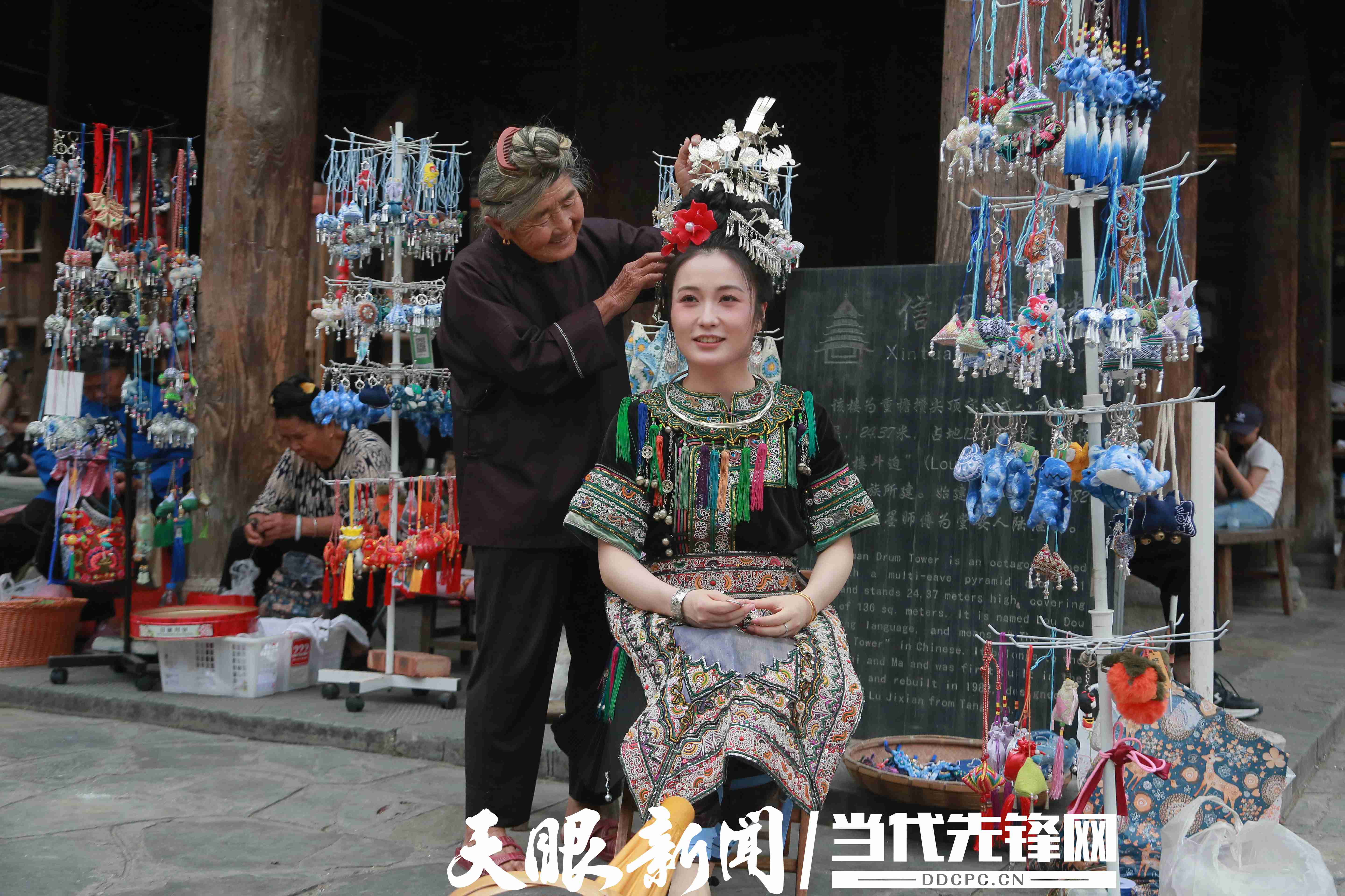 当天,肇兴侗寨的街头巷尾游人如织,处处洋溢着热闹的节日氛围。游客们或驻足文创摊位前,精心挑选富含侗族特色的香囊产品;或走进旅拍店,换上民族服饰记录美好瞬间;亦有三五好友闲坐于咖啡吧、茶吧中,享受假日的轻松惬意。