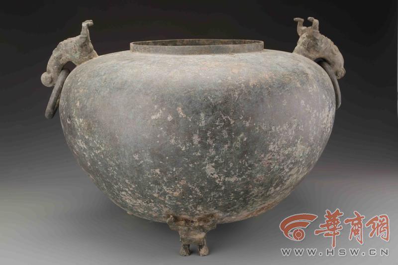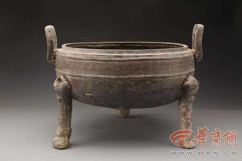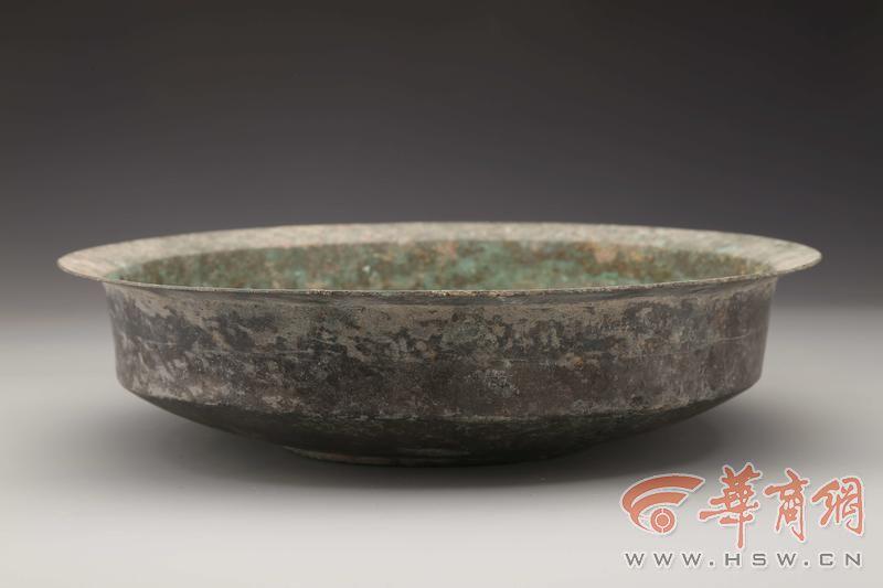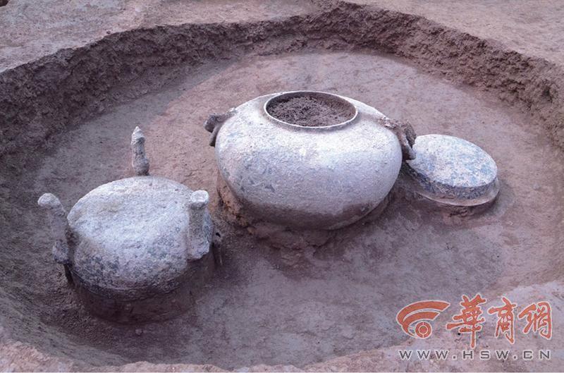 该灰坑深度较浅,显示埋藏过程比较仓促。坑南部出土鼎、浴缶、盘等3件保存较为完整的铜器,鼎、盘位于浴缶两侧,倒扣于坑底,中间的浴缶正面向上。坑内填土中出土有东周时期的陶罐、盆、豆、鬲等、板瓦、筒瓦等残片以及少量仰韶晚期陶器残片。出土的铜鼎、缶、盘非秦文化典型器物,具有战国楚式铜器的风格,其中铜鼎处于战国中期至秦代之间的过渡形态。