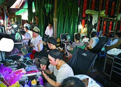 下午演出,演员们在后台化妆,每个人面前都摆上了小电风扇。