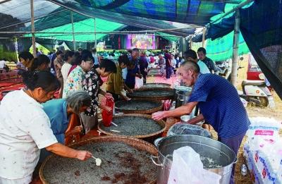 在余干县黄金埠镇十八都陈家戏台旁的集市上,村民们看戏之余免费品尝当地特产糕团。