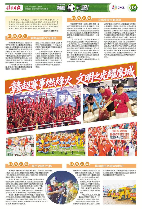 鹰潭队今年的赣超征程虽已止步,但鹰潭的文明城市创建工作仍在继续。通过赛事的举办,鹰潭不仅提升了城市的知名度和美誉度,更让文明理念深入人心,广大市民在参与赛事的过程中也强化了文明意识和责任感。从文明观赛到文明城市创建,鹰潭正以实际行动书写着城市文明发展的新篇章。