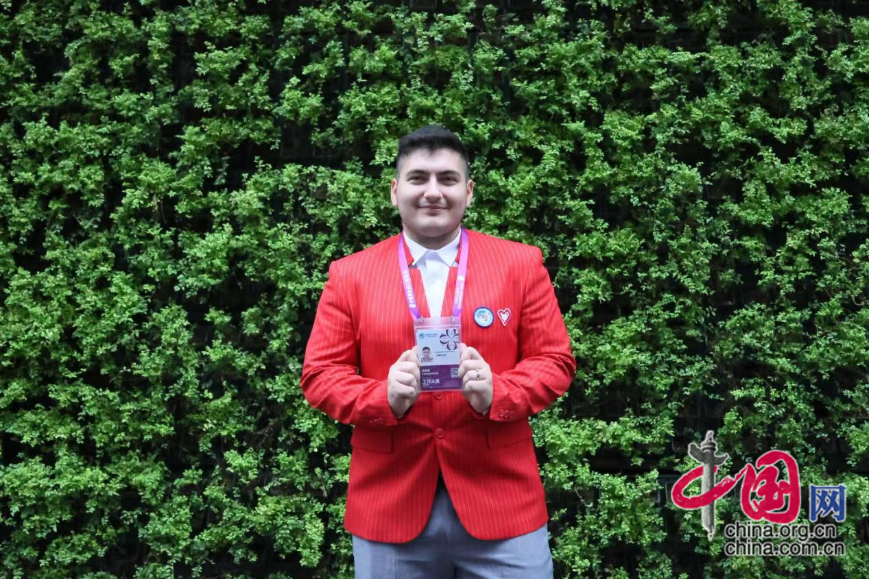 第一次参与进博会志愿者工作的斯巴达克。上海师范大学俄罗斯留学生志愿者斯巴达克摄