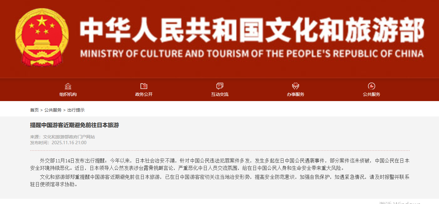 文化和旅游部发布的消息显示,外交部11月14日发布出行提醒:今年以来,日本社会治安不靖,针对中国公民违法犯罪案件多发,发生多起在日中国公民遇袭事件,部分案件迄未侦破,中国公民在日本安全环境持续恶化。近日,日本领导人公然发表涉台露骨挑衅言论,严重恶化中日人员交流氛围,给在日中国公民人身和生命安全带来重大风险。 文化和旅游部郑重提醒中国游客近期避免前往日本旅游,已在日中国游客密切关注当地治安形势,提高安全防范意识,加强自我保护,如遇紧急情况,请及时报警并联系驻日使领馆寻求协助。
