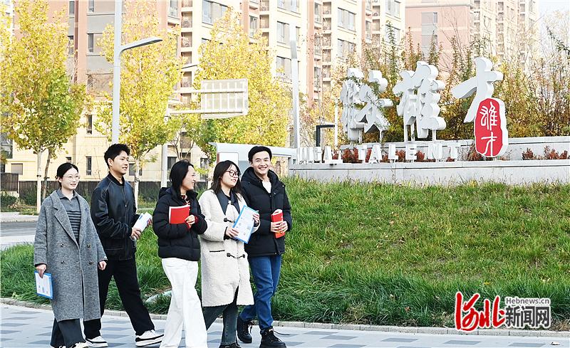 11月11日,雄安新区容东片区街头,一群年轻人前往雄才大厦咨询人才政策。 河北日报记者 刘光昱摄