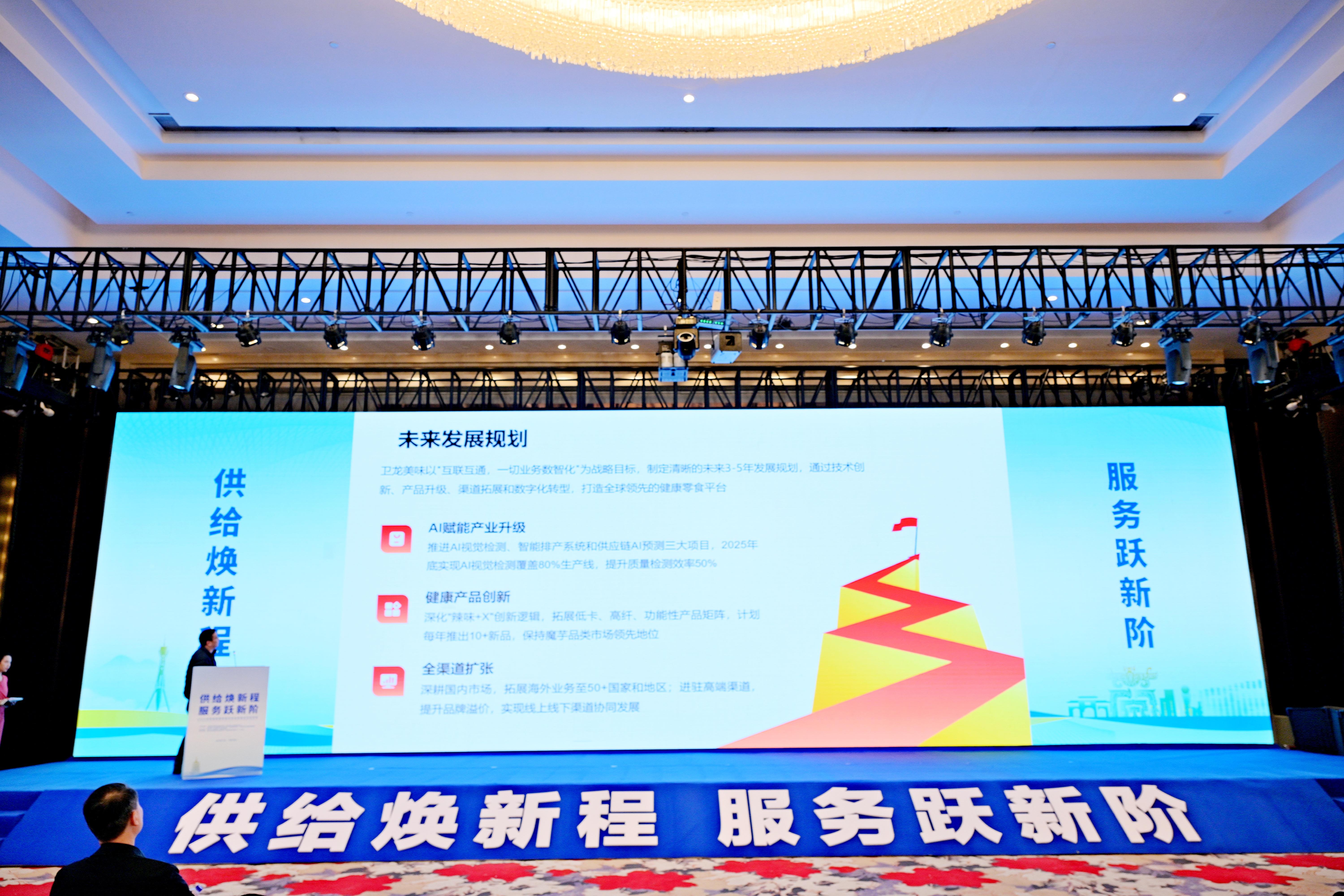 谈及未来,许坤朋表示,卫龙已制定3~5年发展规划,核心目标是实现“互联互通,一切业务数智化”。目前,公司正在推进AI视觉检测、智能排产等项目的落地,预计2025年底AI质检将覆盖80%生产线,效率提升50%。同时,将继续深化“辣味+X”创新逻辑,每年计划推出10款以上健康化新品。在深耕国内市场的同时,计划将业务拓展至全球50多个国家和地区,并通过进驻高端渠道提升品牌价值。