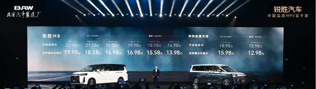 2025年12月5日,锐胜汽车首款全场景舒享大型MPV——锐胜M8正式上市,消费者在享受了用户"抢鲜"补贴和国补政策之后,其限时售价直接低至12.98万元起。