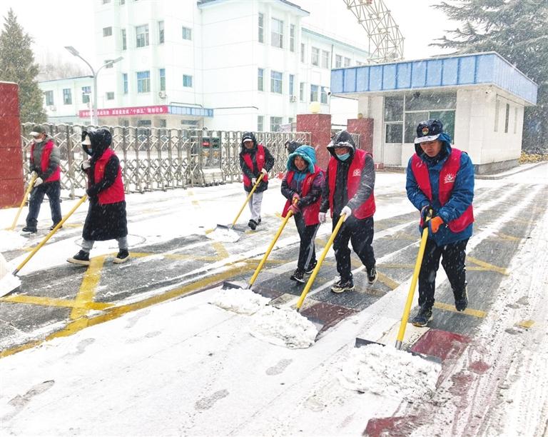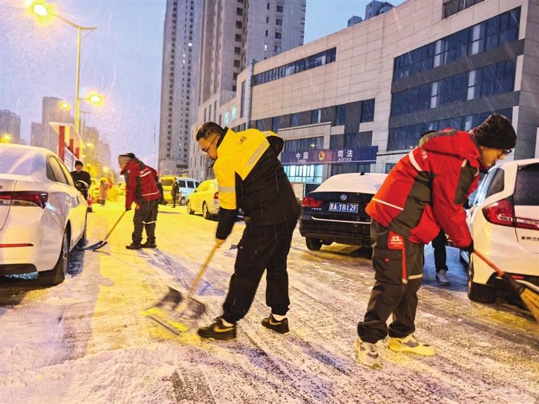 凌晨5时,玉园南社区干部带头组织志愿者手持铁锹、雪推板,重点对背街小巷、社区院内,以及社区广场、老年活动中心等人员密集区域开展集中清雪。