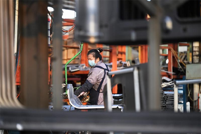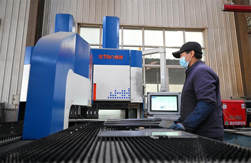 12月8日,霸州市明月汽车配件厂工人在利用柔性自动折边机加工汽车零部件。