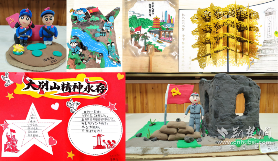 同时,在校内也开设了“弘扬大别山精神”学生作品主题展区。展览按年级分区,低年级“红色贺卡寄深情”,贺卡描绘红色场馆中印象最深刻的革命文物,或用树叶、彩纸拼贴出“小红星”等立体造型,传递对先辈最纯真的敬意。中年级“彩泥绘精神,初心映崇敬”,以大别山革命者的战斗场景、日常奋斗画面为原型,捏制“我心中的大别山精神”彩泥作品。高年级“寻迹大别山,绘写武汉情”,再现大别山革命先辈翻山越岭、无私奉献的身影,展示武汉现代化繁荣风貌。
