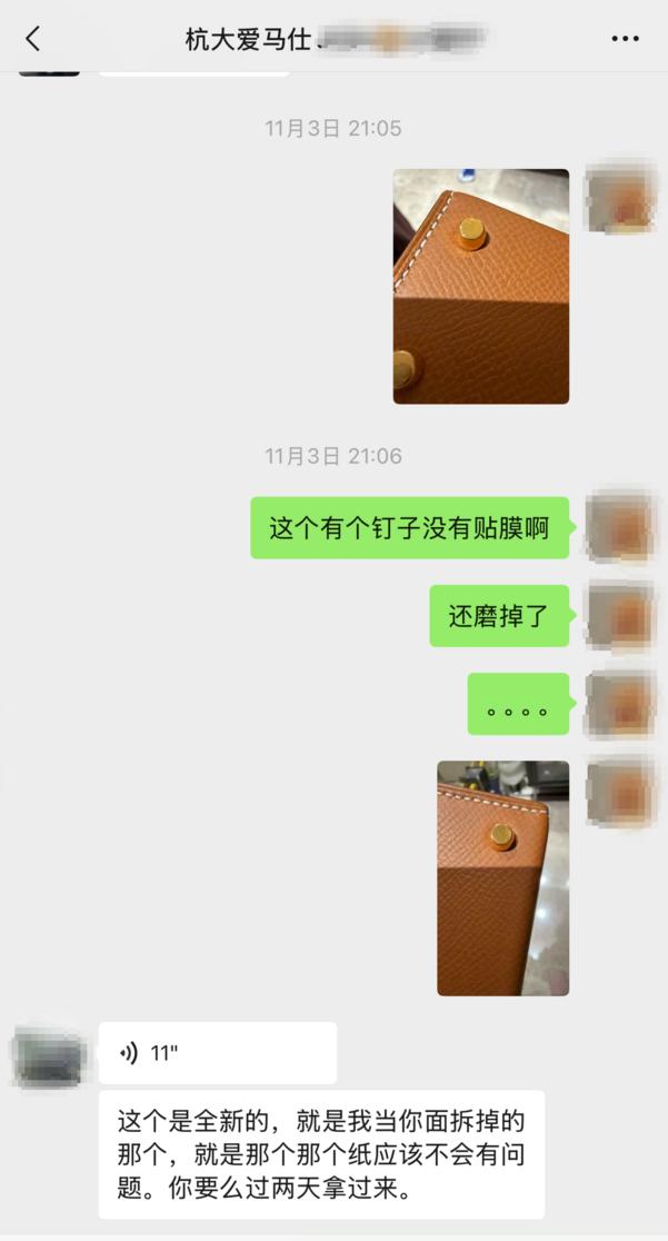 “五金件贴膜,是爱马仕品牌包全新的标志,这个手提袋明显不是全新的。”陈女士第一时间通过微信联系销售。