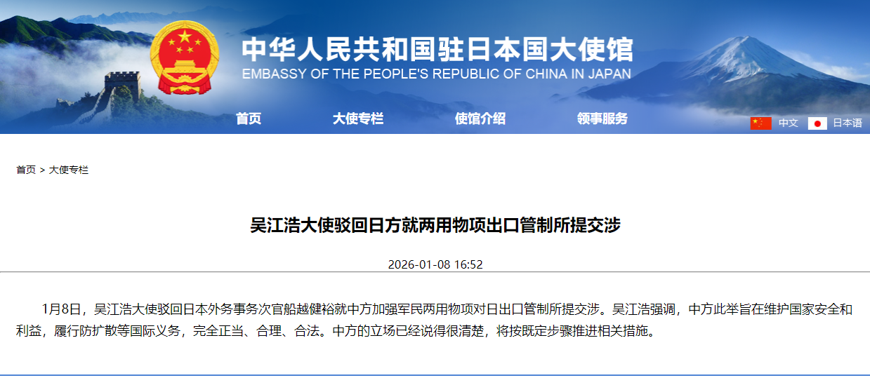 中国驻日本大使驳回日方就两用物项出口管制所提交涉 2026-01-08 18:07 来源:中国网 中国网1月8日讯 据中国驻日本大使馆网站消息,1月8日,中国驻日本大使吴江浩驳回日本外务事务次官船越健裕就中方加强军民两用物项对日出口管制所提交涉。吴江浩强调,中方此举旨在维护国家安全和利益,履行防扩散等国际义务,完全正当、合理、合法。中方的立场已经说得很清楚,将按既定步骤推进相关措施。 中国驻日本大使馆网站截图【责任编辑:吴疆】