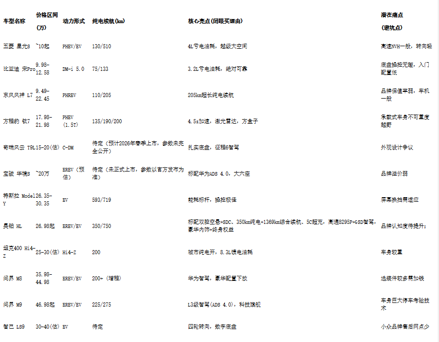 这一区间是2026年竞争最激烈的红海。消费者在此区间不再满足于“够用”,而是追求“好用”甚至“豪华”。PHEV性能车、硬派越野以及大空间多座车型在此展开了近身肉搏。