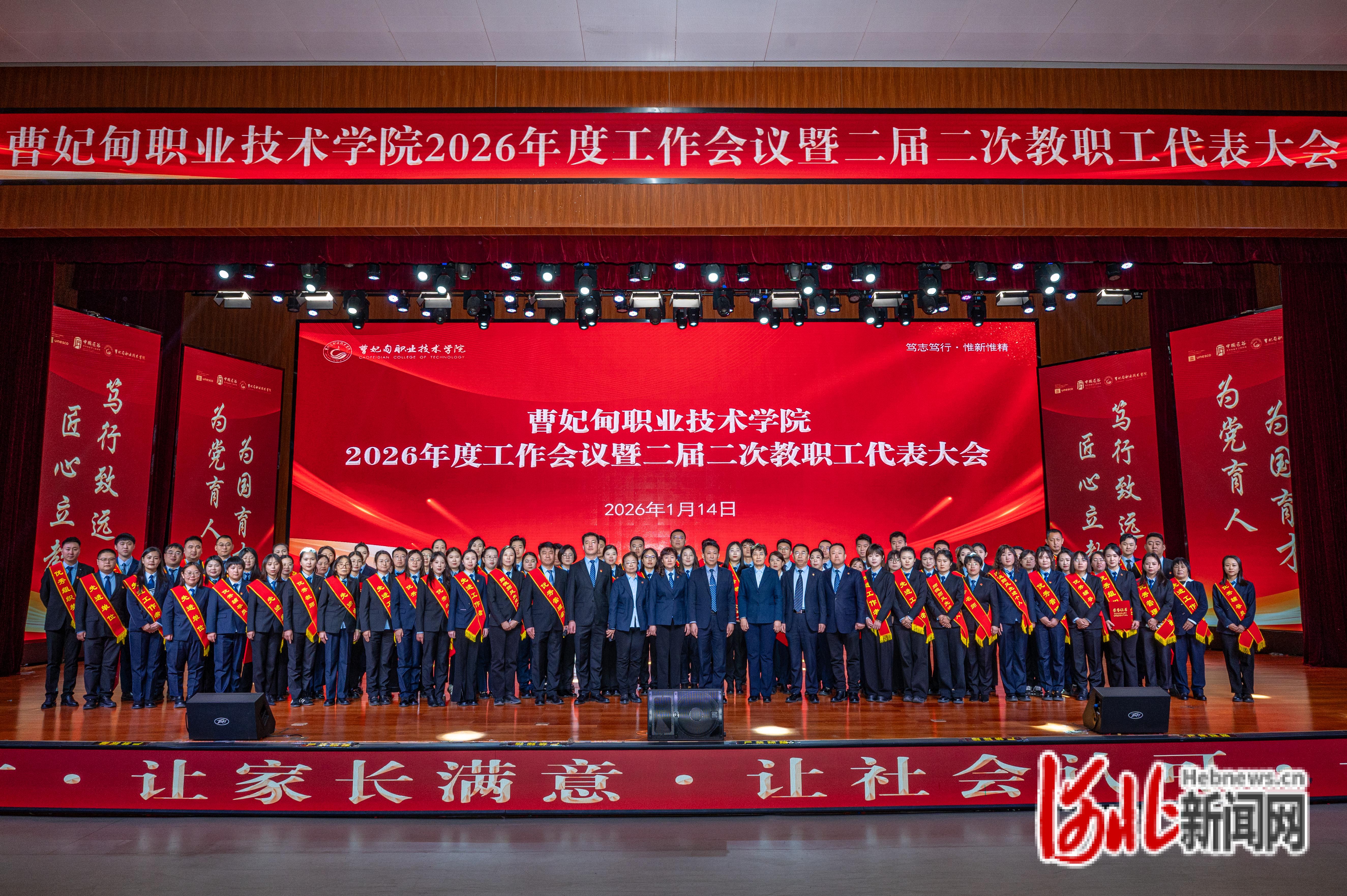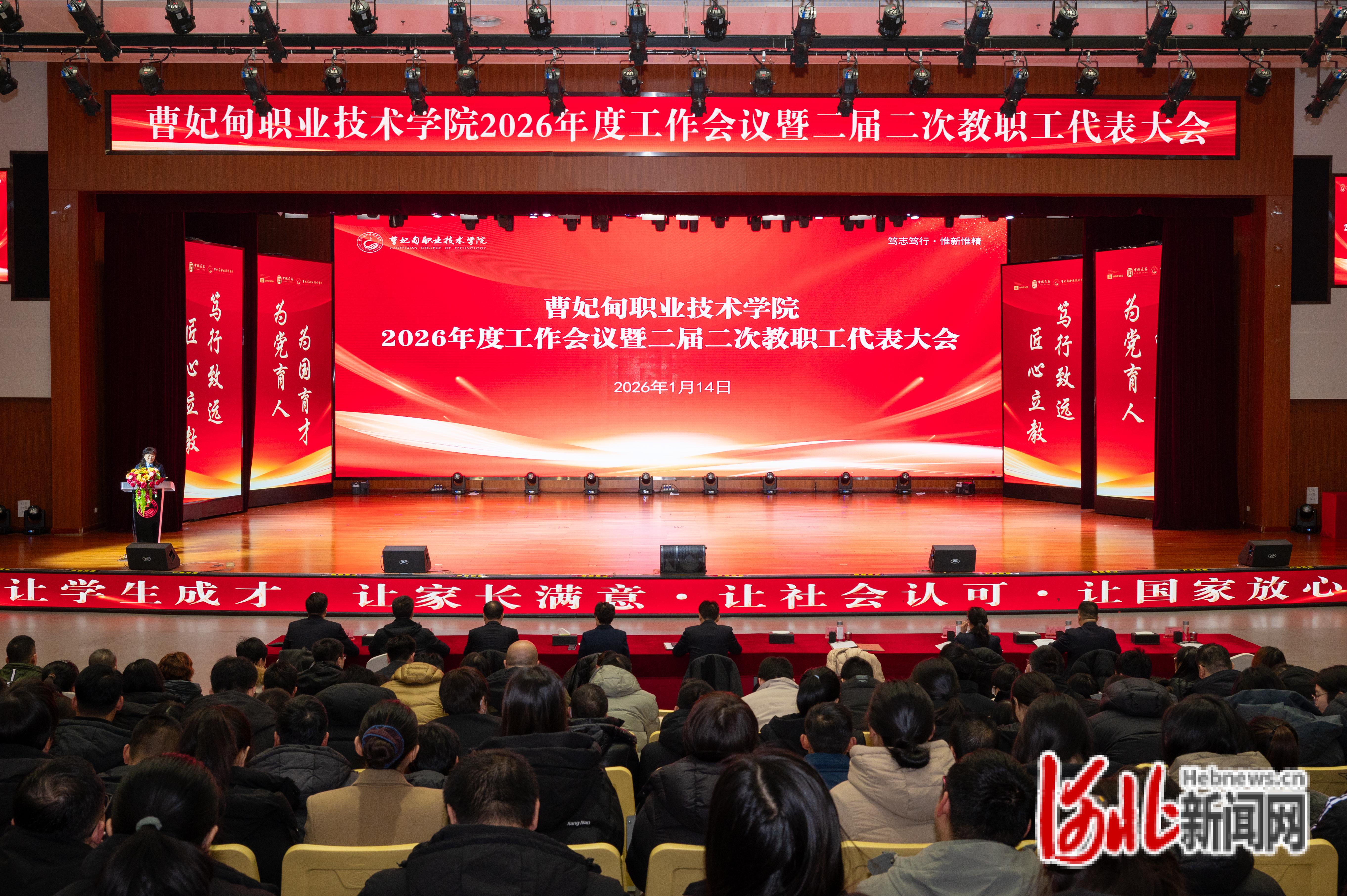 河北新闻网讯(李鹏、杨帅、刘佳豪)1月14日上午,曹妃甸职业技术学院2026年度工作会议暨二届二次教职工代表大会在活动中心召开。董事长薛怀南,校领导刘彩琴、王艳丽、刘杰、白洁、张宁、闫长宝、李红涛、王磊及学校中层领导干部、全体教职工齐聚一堂,总结2025年丰硕成果,部署2026年重点任务,表彰先进典型,凝聚发展共识,为学校高质量发展蓄力启航。