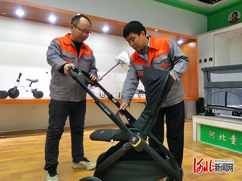 1月21日,在河北童翔童车有限公司商品展示区,总经理温志朝(右)与技术人员展示高景观婴儿推车各项功能。 河北日报记者 陈 正摄