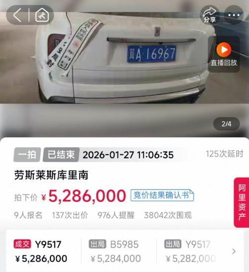 大皖新闻讯 1月27日上午,大皖新闻记者从阿里资产平台看到,一辆涉刑资产劳斯莱斯库里南拍卖结束,起拍价471万元,经过137次出价,最终以528.6万元成交,高出评估价57.6万元。