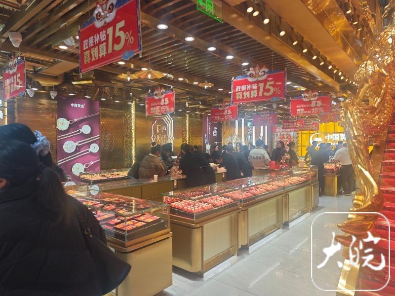 在中国黄金门店内,金价为1238元每克,店员表示这是公司补贴15%后的价格,“临近春节有优惠”。对于想要以旧换新的顾客,他们也不会收取额外的费用,仅需支付增重克数的金价和部分加工费。